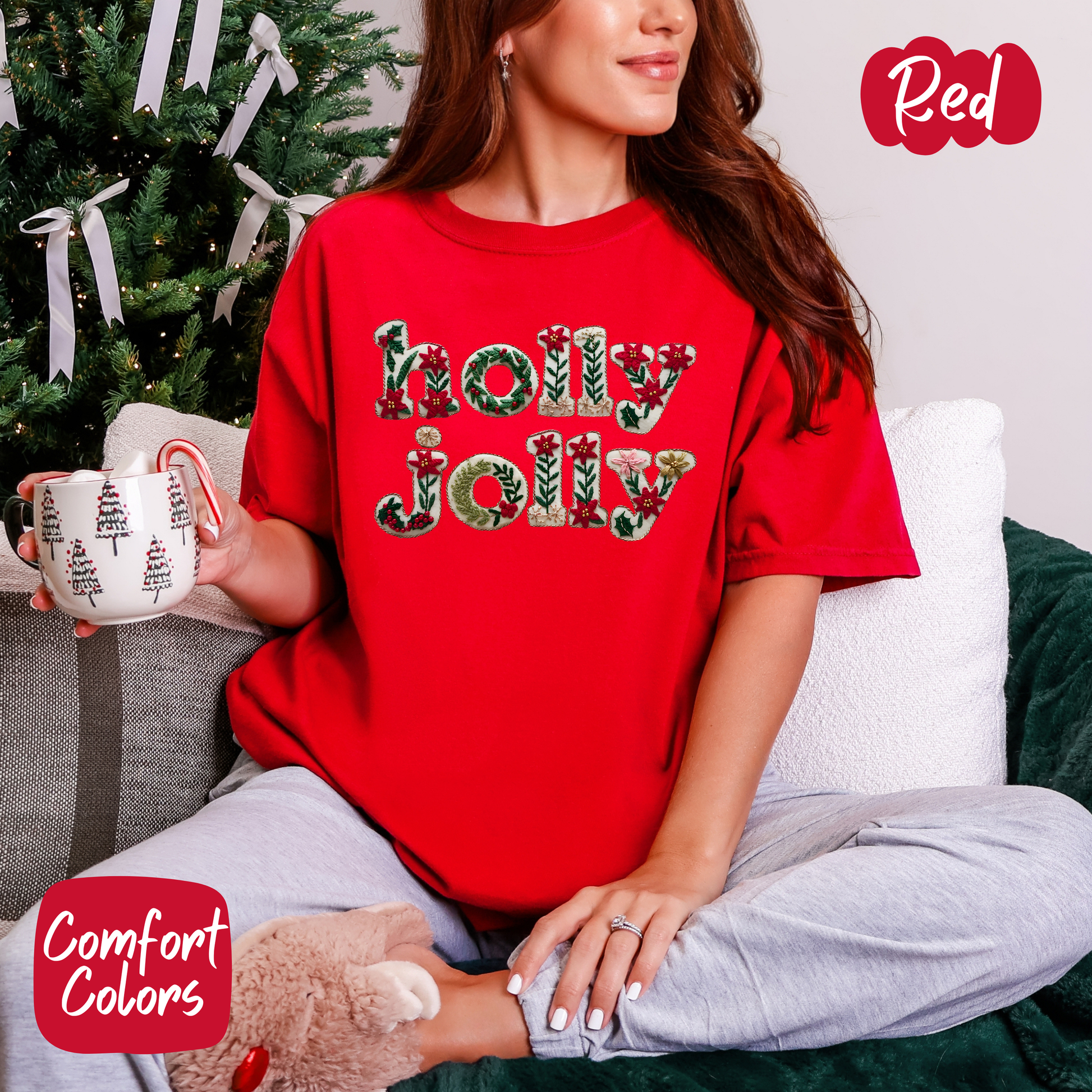 Spread holiday cheer with this playful crewneck featuring faux embroidery that brings festive flair to your seasonal wardrobe. The design showcases "Holly Jolly" in cheerful lettering, adorned with vibrant red and green flowers that capture the spirit of the season. Perfect for casual gatherings, cozy nights in, or anyone who loves a touch of whimsy during the holidays. Comfortable and eye-catching, this shirt is your go-to piece for festive fun.