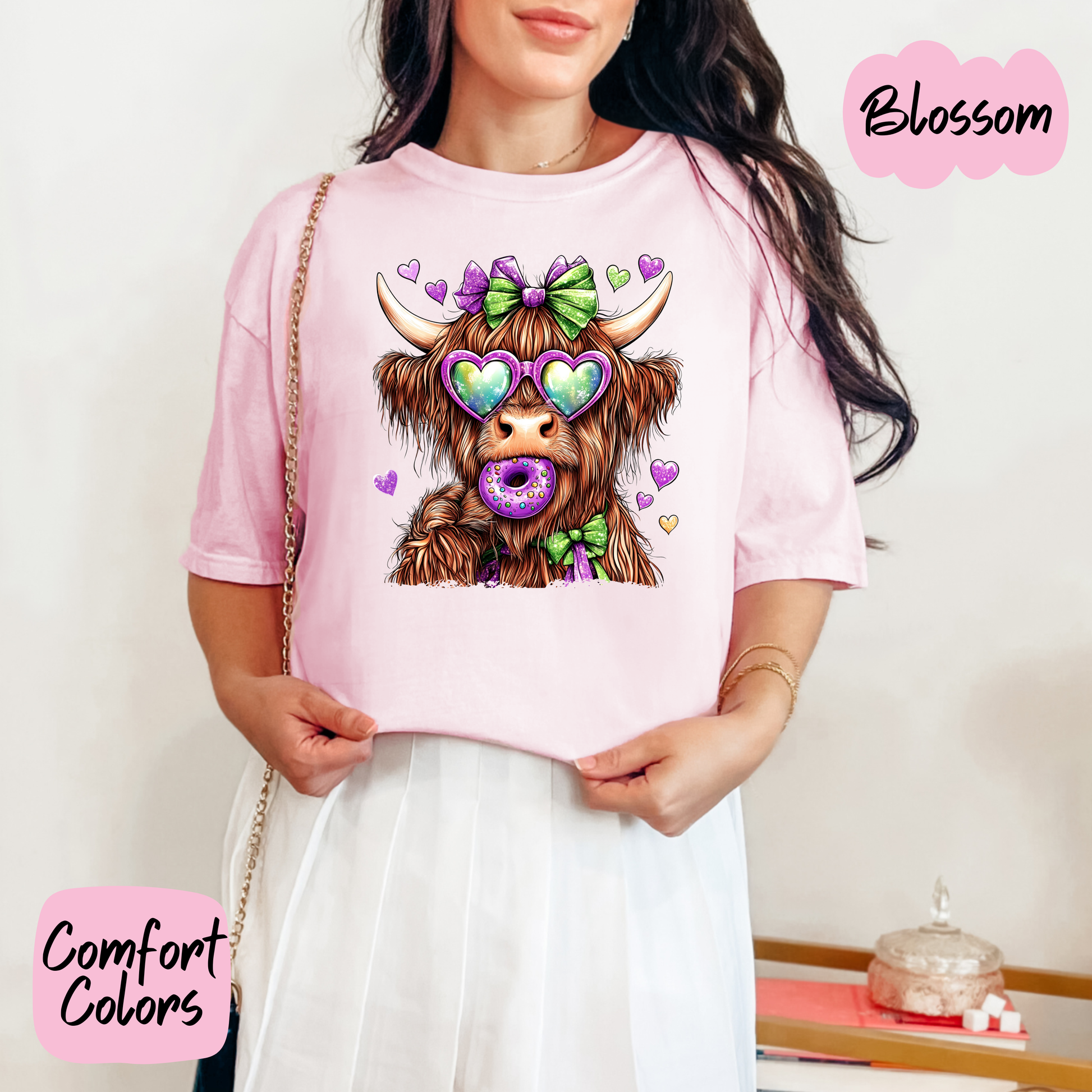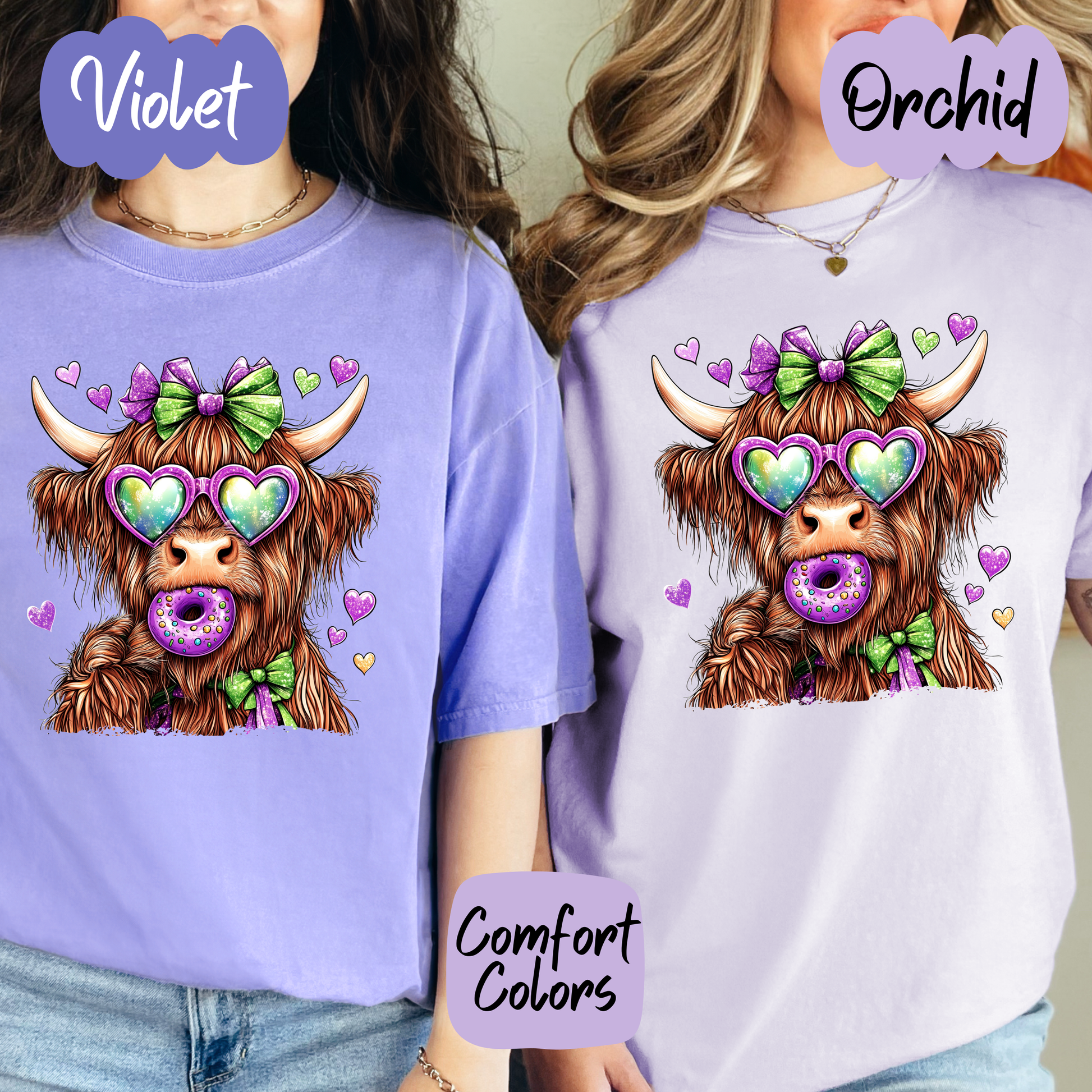 This Mardi Gras Highland Cow Shirt/Crewneck is absolutely udderly adorable! A trendy highland cow rocks a festive bow, cool sunglasses, and a delicious donut—all decked out in vibrant Mardi Gras colors. It's the perfect mashup of cute, quirky, and celebratory that brings together everything fun about the season. Whether you're a cow enthusiast, a donut devotee, or just love designs that make you smile, this crewneck delivers charm and personality in spades. Wear it to spread joy, laughs, and serious Mardi Gras vibes wherever you roam!