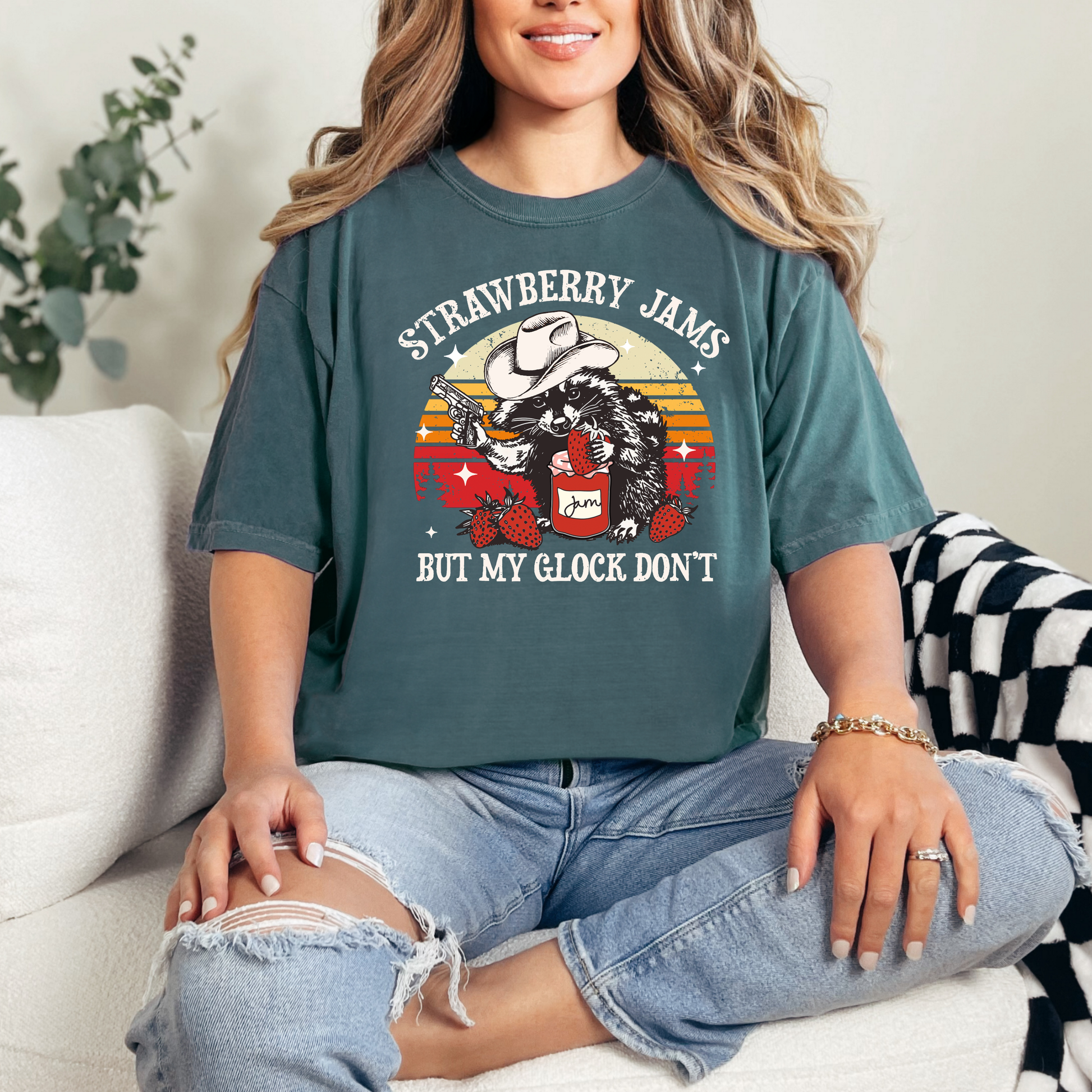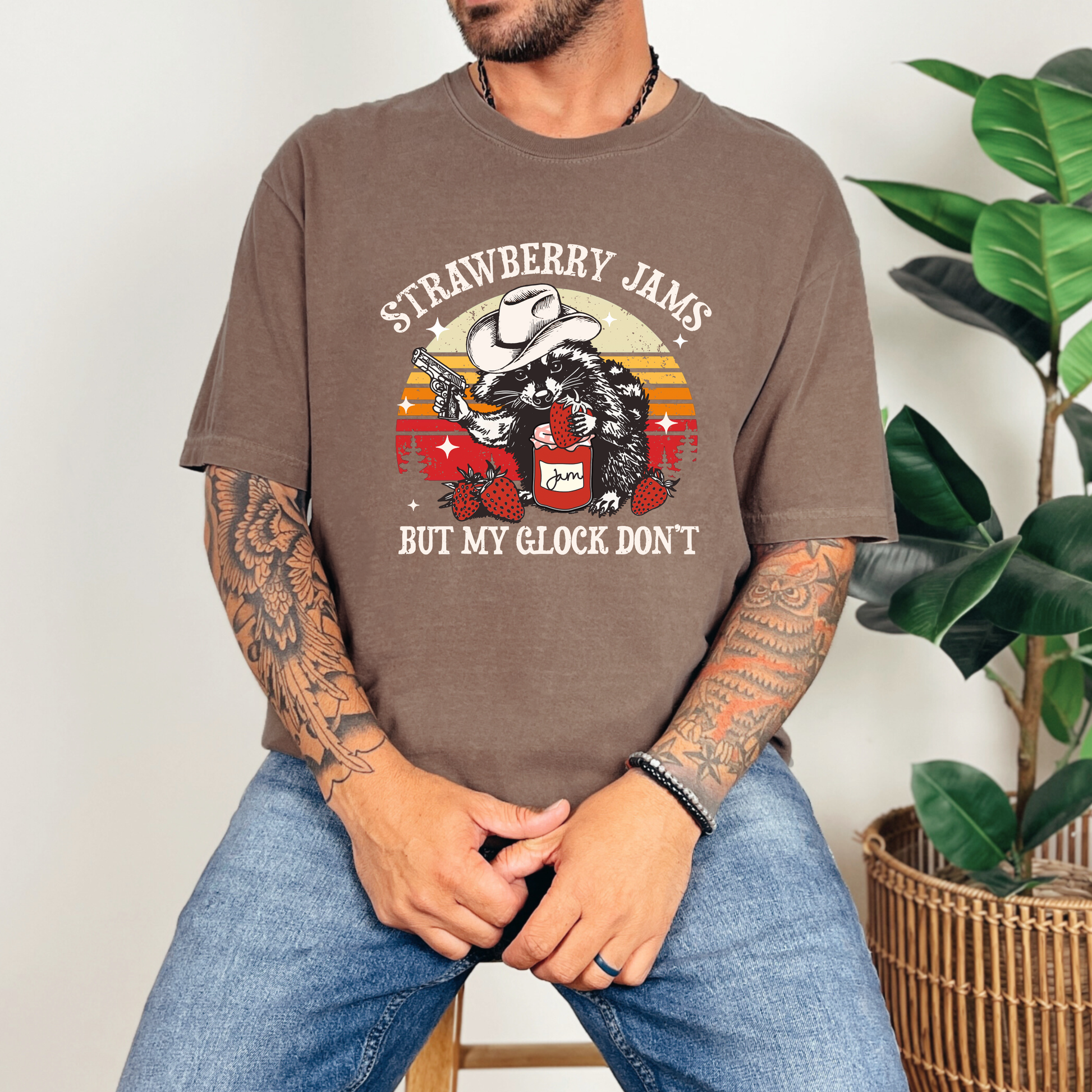 Add some playful mischief to your wardrobe with the Strawberry Jams but my Glock Don’t Shirt. Featuring an adorable raccoon clutching a jar of jam, this quirky design perfectly blends sweetness with a sassy edge. Great for those who love a little fun with their style.